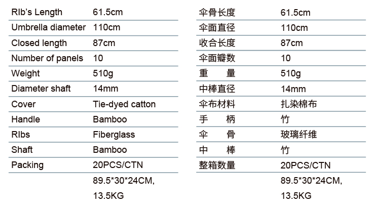 Simple pull opening with safety bamboo runner, bamboo shaft, fiberglass ribs match color,Bamboo handle, with handwork Tie-dyed cotton fabric, waterproof,windproof.